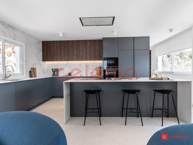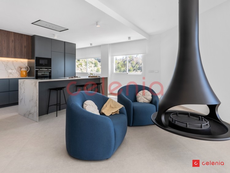 Im Erdgeschoss befinden sich ein geräumiges Wohn-Esszimmer, das zur Terrasse hin offen ist, und die große Küche mit einer zentralen Kochinsel und einer großen Frühstücksbar, ein offener und kommunikativer Raum, der verschiedene Atmosphären schafft. Alle Räume sind mit Nussbaumholz, grauen Dekorationselementen, einem riesigen freistehenden Kamin und großen Fenstern ausgestattet, die den Innen- und Außenbereich miteinander verbinden und einen großen Raum schaffen, den man dank des wunderbaren mediterranen Klimas praktisch das ganze Jahr über genießen kann und der das Haus mit Licht durchflutet.