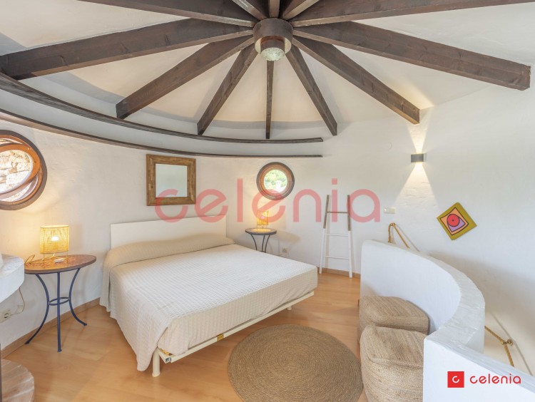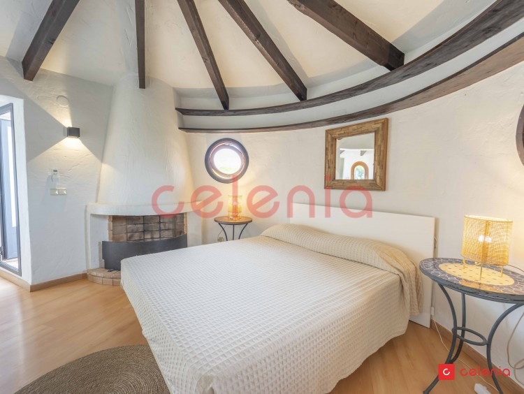 Die dritte Etage, die über eine Innentreppe mit schwebenden Stufen erreichbar ist, verfügt über ein charmantes Schlafzimmer im Mansardenstil mit kreisförmig angeordneten Holzbalken, Kamin und offenem Badezimmer, alle mit Zugang zu einem großen Solarium, wo Sie die so charakteristische Zeit genießen können der weißen Küste, ganz zu schweigen von der spektakulären Aussicht.